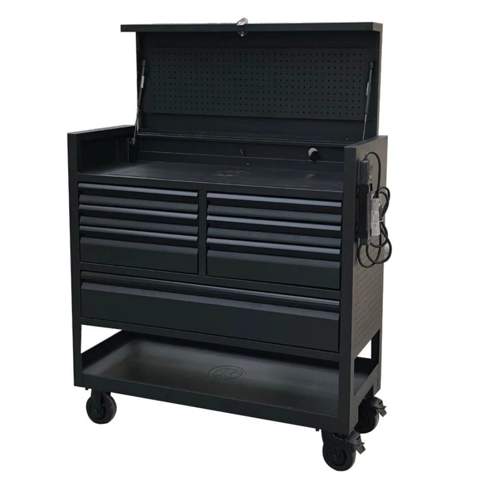 This Kobalt 3000 series heavy duty mobile work cart is ready to serve! With over 19,000 cu. inches of storage and a 2000 lb load capacity, this mobile work cart is built to last. This cart has heavy duty, ball bearing drawer glides for smooth functionality when fully loaded. Couple this with their soft close feature and you don’t have to worry about the drawers opening or slamming shut when you are moving around. Coordinating custom fitted drawer liners protect your tools from scratching or rolling around. This box is built tough with double walled construction and heavy duty, industrial strength casters that can hold up to 2000 lbs and continue to roll smoothly. Gas lifts mean opening and lower the lid is easy. The top is reinforced with a large panel that is perforated to act as a pegboard when the top is open. A magnetic power supply with USB ports is included to allow you to place the power where you need it. The open shelf space on the bottom is great for storing larger items or cases. Recessed sure grip side handles make maneuvering a snap. And if that was not enough, this cart is stocked with Kwikset Smartkey technology.