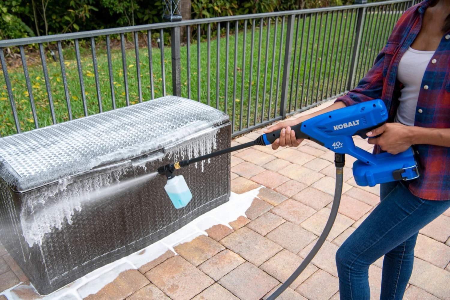 Compact, lightweight, and easy-to-use, the Kobalt 40-volt Power Cleaner is a must-have. With 600 PSI at 0.8 GPM, there’s plenty of power for cleaning windows, outdoor furniture, cars, boats, campers, and more. It features a versatile 5-in-1 nozzle for cleaning dirt and debris from a variety of surfaces, and works with any typical garden hose (3/8-inch quick-connect fitting is included). When a garden hose spigot isn’t available, the 20-ft self-siphoning hose pulls water from any fresh water source. The slip-resistant rubber molded grip is comfortable and ergonomic for less user fatigue. When the cleaning is done and it’s time to store it in the garage or shed, the wand is super-easy to remove for more compact storage. The Kobalt power cleaner has a water-resistant battery compartment for added protection, and is compatible with all 40-volt Kobalt batteries.