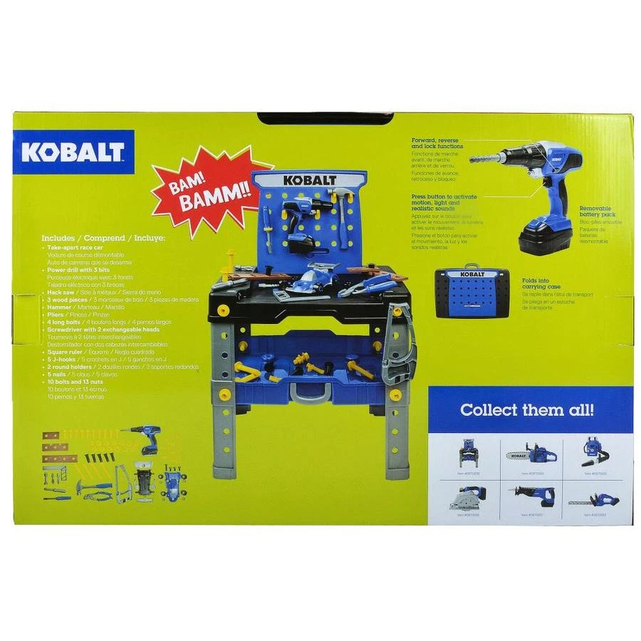 Hours of fun for your child contained in one case! Our toy Kobalt™ Work Bench and Tool Set is 54 pieces of childhood delight. Unassembled, the entire set folds into one carrying case. When assembled, your little carpenter has his own workbench and numerous accessories for hours of building and imaginative fun. This toy tool set includes a power drill with three bits, a hack saw, a hammer, a screwdriver with two exchangeable heads, a pair of pliers, a square ruler, and a take-apart race car… plus more! For ages 3 years and up. Collect all six special holiday Kobalt™ toys for a complete set!