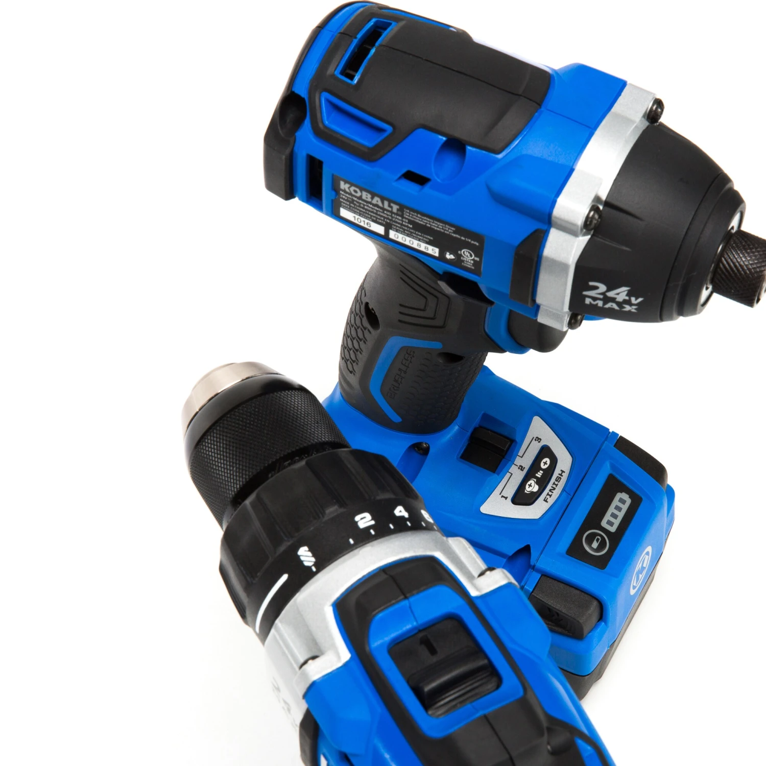 - Kobalt 24-volt cordless combo kit includes 1/2-in brushless drill/driver, 1/4-in brushless impact driver, 2.0Ah battery and charger