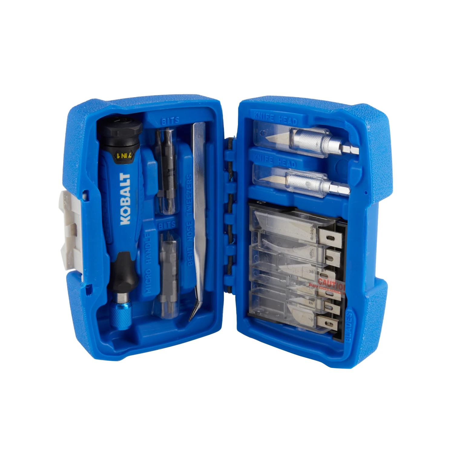 - One 1/4-in hex micro speed fit handle with in-handle storage, (12) 1-in Phillips/slotted driver bits, bent nose tweezers, small and med 1/4-in hex shank knife heads, (20) precision knife blades in a variety of types/sizes, and a blow molded case