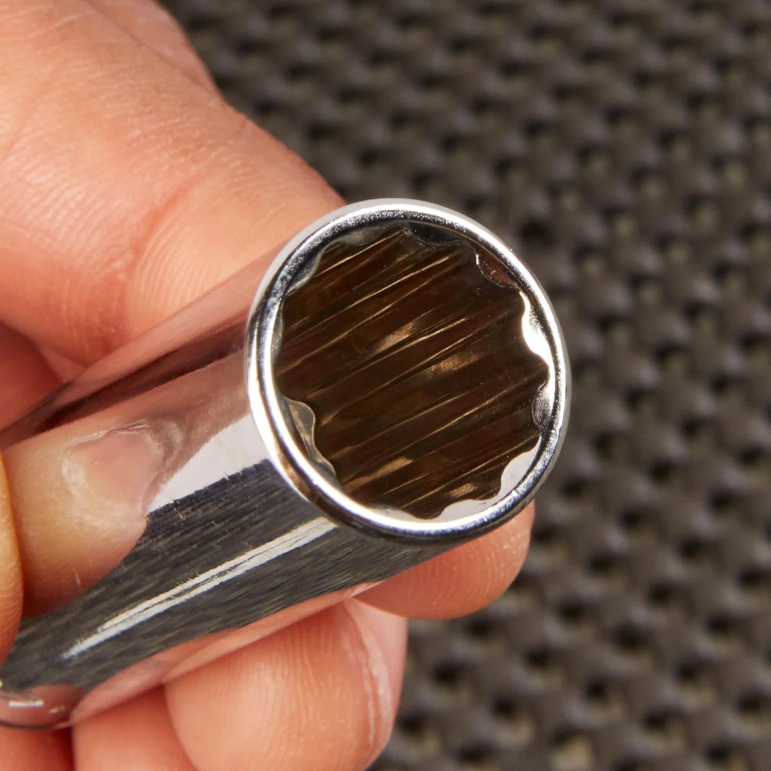 - 12-Point socket design allows work on multiple fastener types including 6-point, 12-point, square, star and some rounded