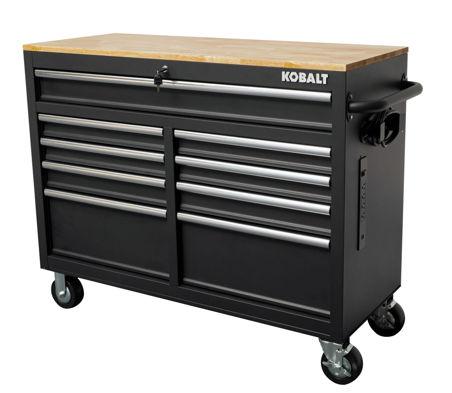 The Kobalt 46 in. 9 drawer mobile workbench is great for storing and organizing all your tools and hardware. The unit is made from high grade all welded steel construction with a tough, rust-resistant powder coat finish. 9 Drawers are soft-close full-extension and glide effortlessly on ball-bearing slides that can support up to 100 lbs. solid wood top with protective coating provides great work surface. You can charge your electronics and power tools even when the chest is locked via the integrated power strip with 4-outlets and 2-USB ports. An ergonomic handle and 5 in. x 2 in. casters allow you to easily move your cabinet around your workspace. Total weight capacity of the unit is 1,200lbs.