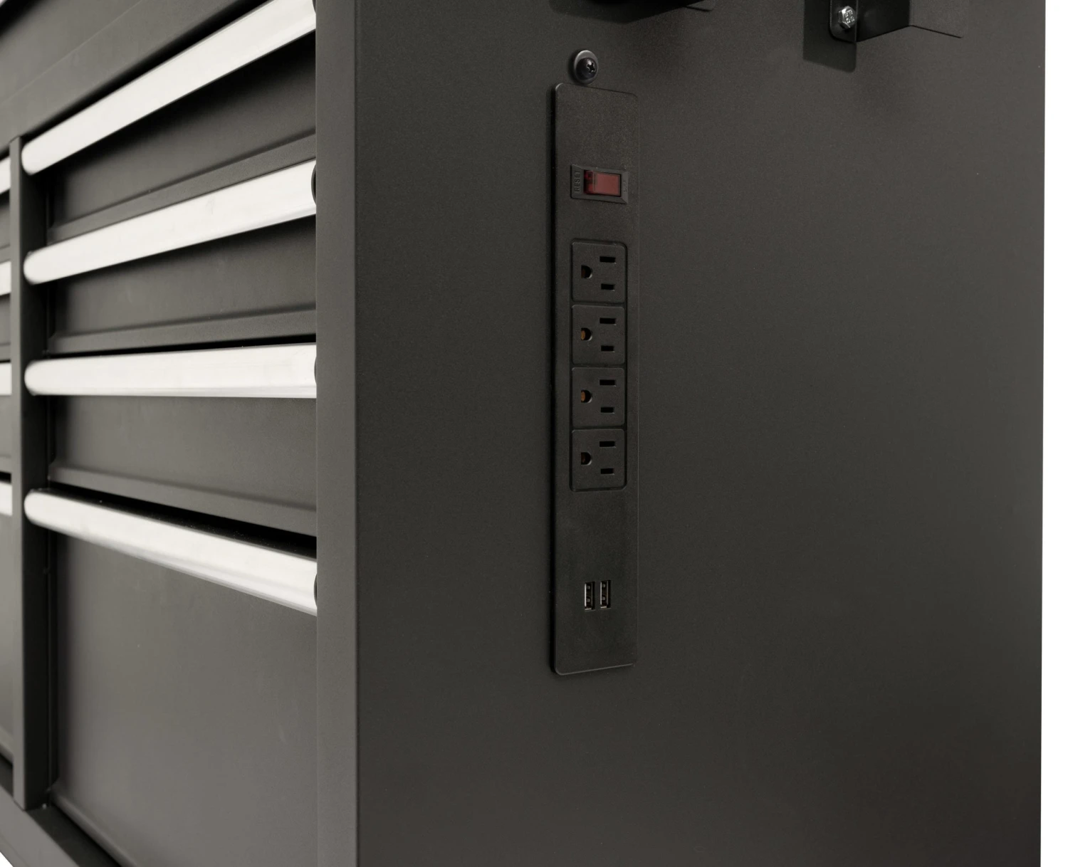 - Integrated power strip with 4-outlets and 2-USB ports for easy charging